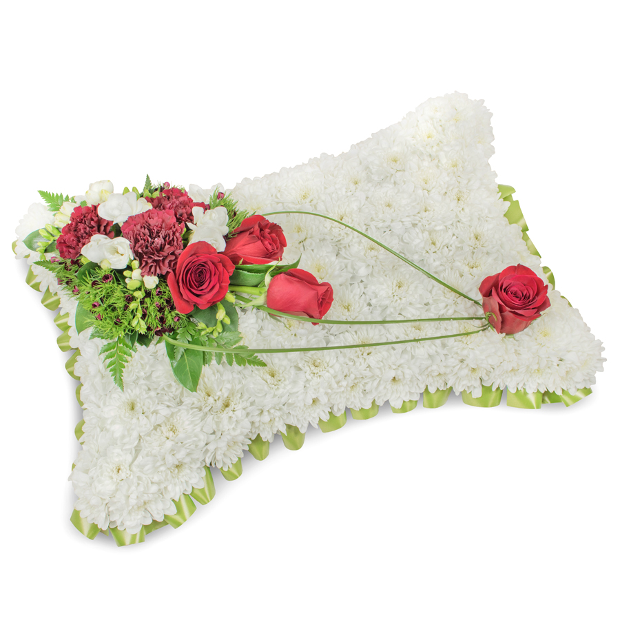 Honor someone special with a tribute of elegant beauty. Our breathtaking arrangement features a delightful mix of white chrysanthemums, passionate red roses, gentle white freesias, luxurious dark red carnations, charming dianthus, and soft bear grass. Each flower is carefully hand-selected to ensure optimal freshness and vivid color.